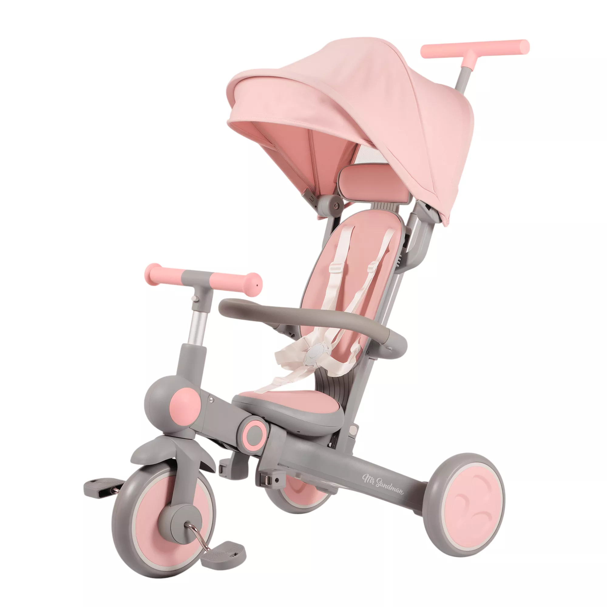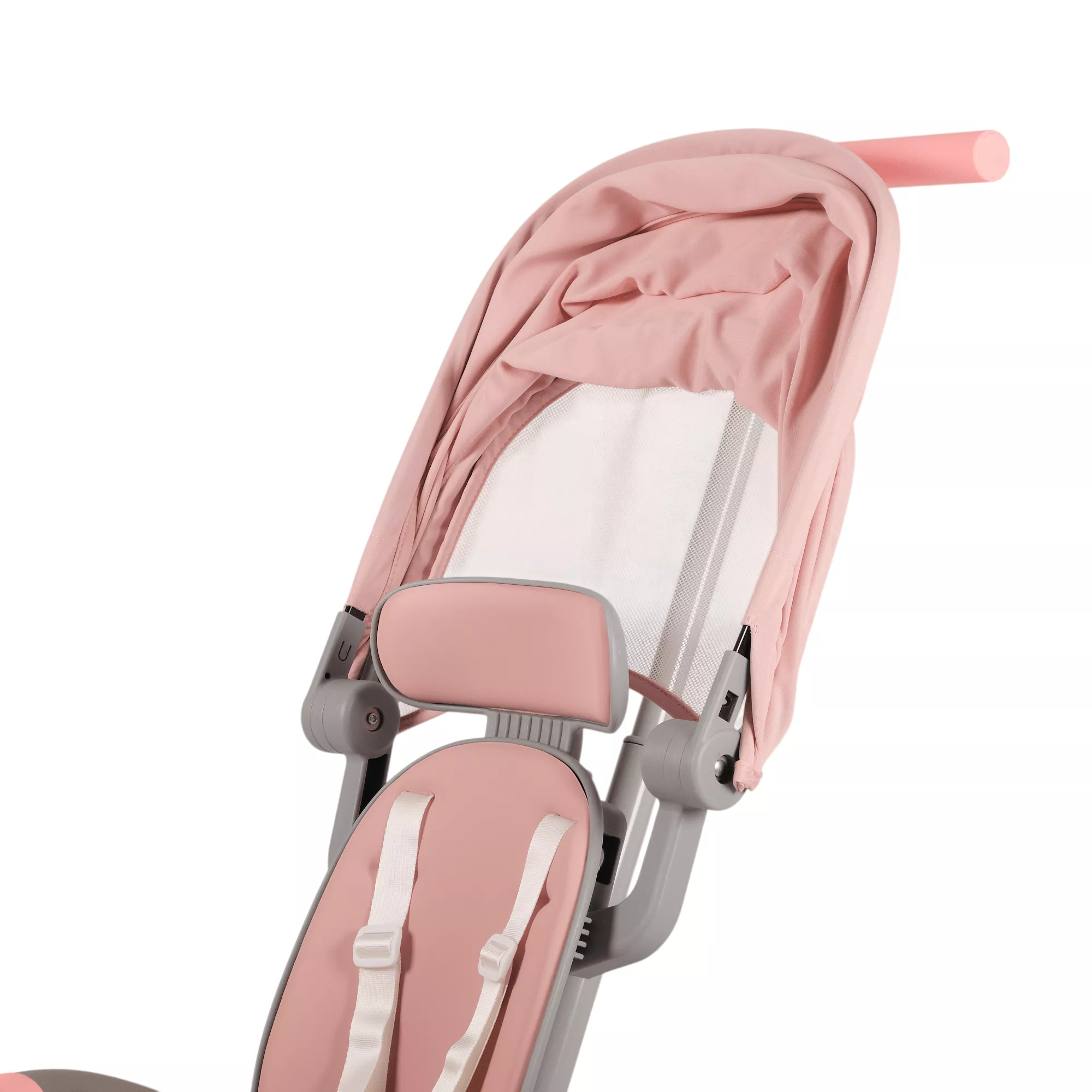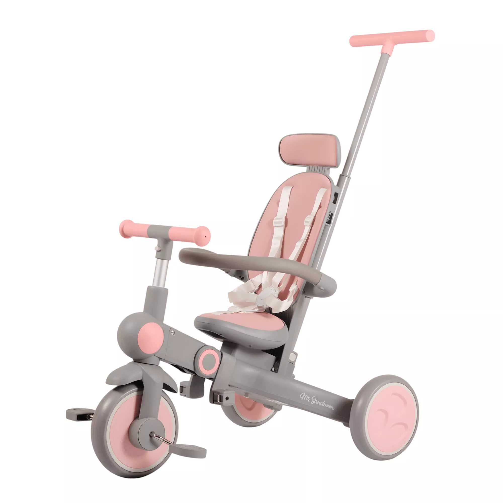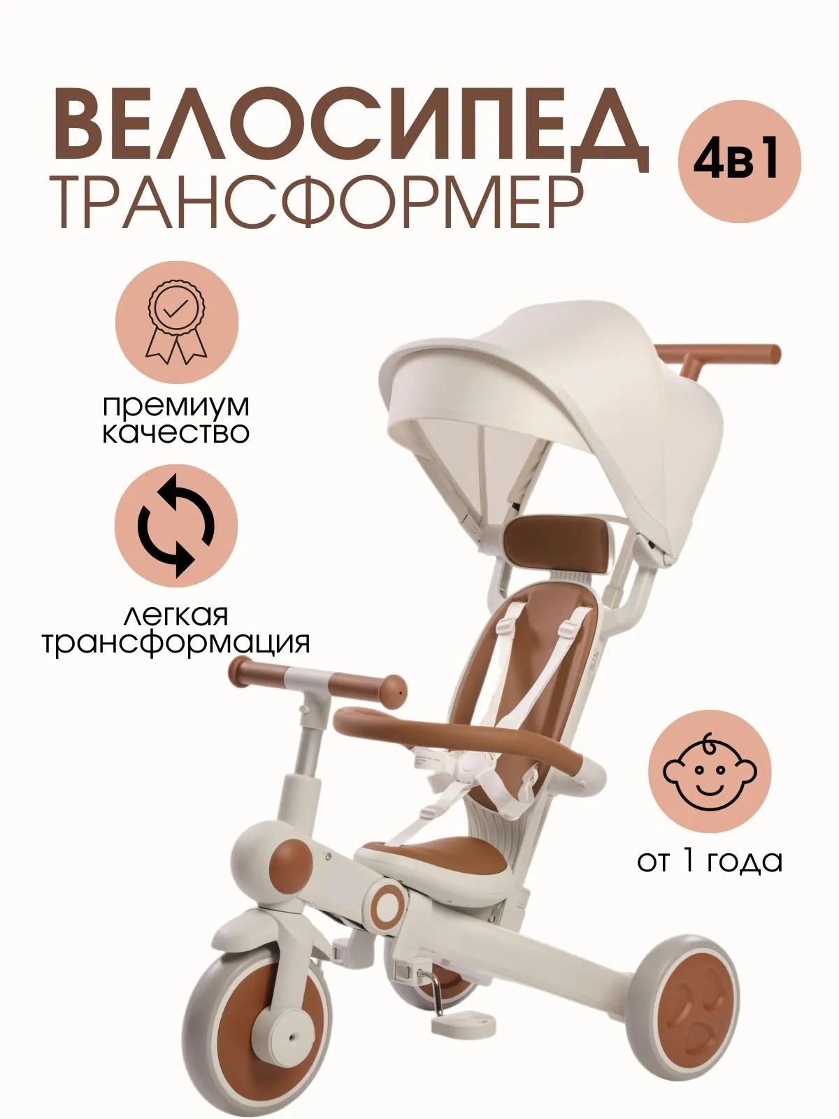 Все детали велосипеда снимаются: родительская ручка, капюшон от солнца, бампер, педали, спинка. Седло и спинка очень удобные и мягкие. Благодаря съемным переустанавливаем педалям, получаем удобную подставку под ноги для самых маленьких.Многофункциональный велосипед трансформер имеет 4 варианта конфигурации в зависимости от потребностей ребенка.