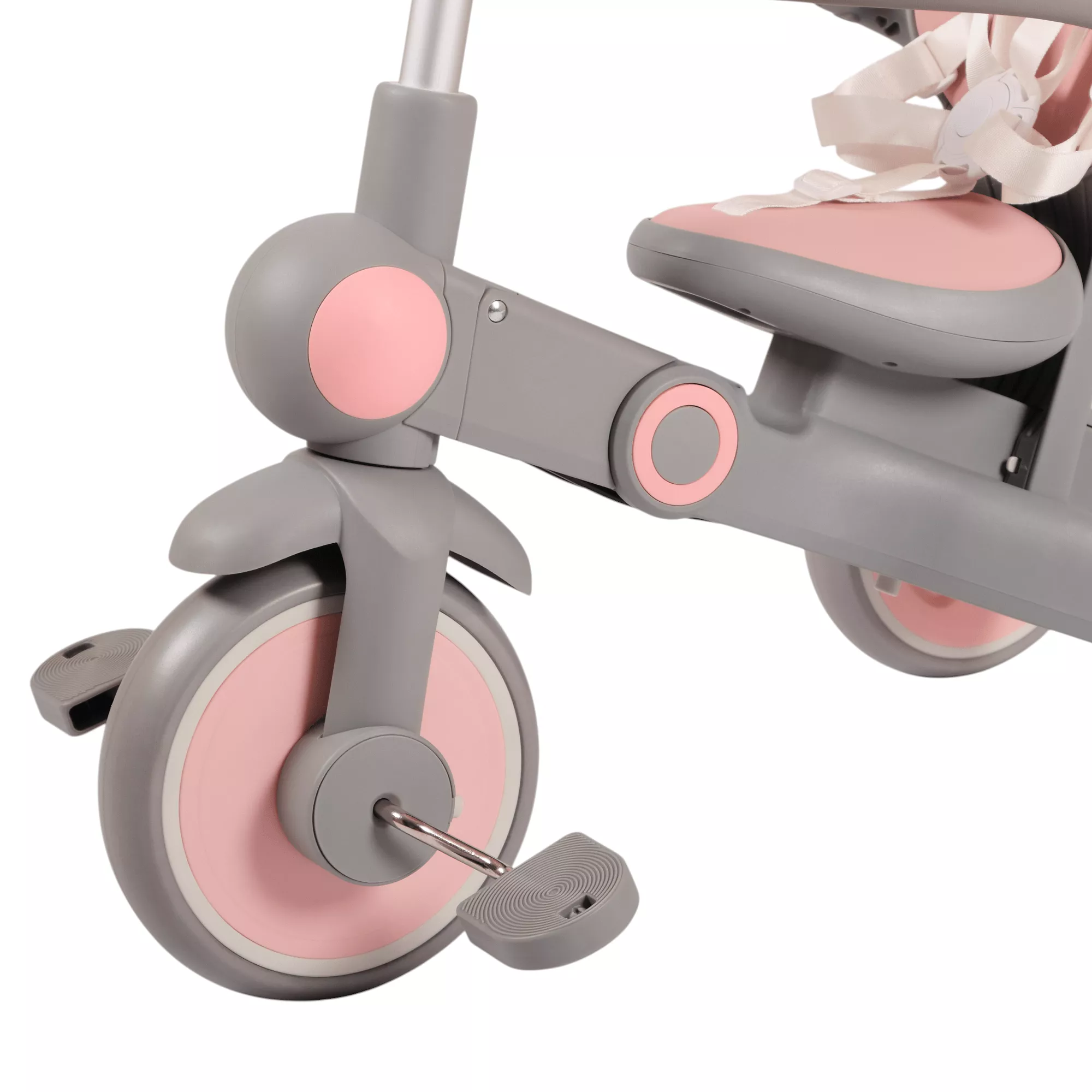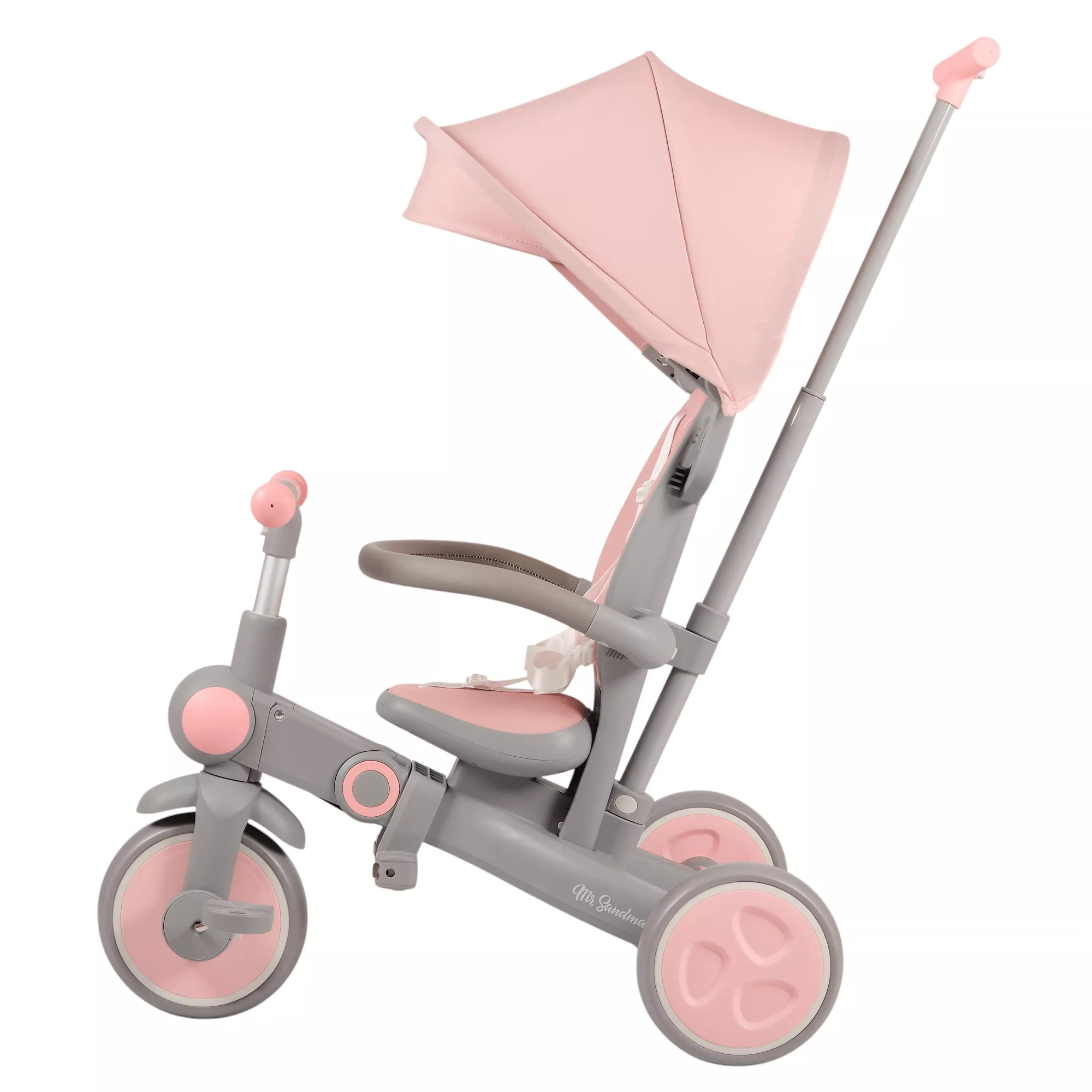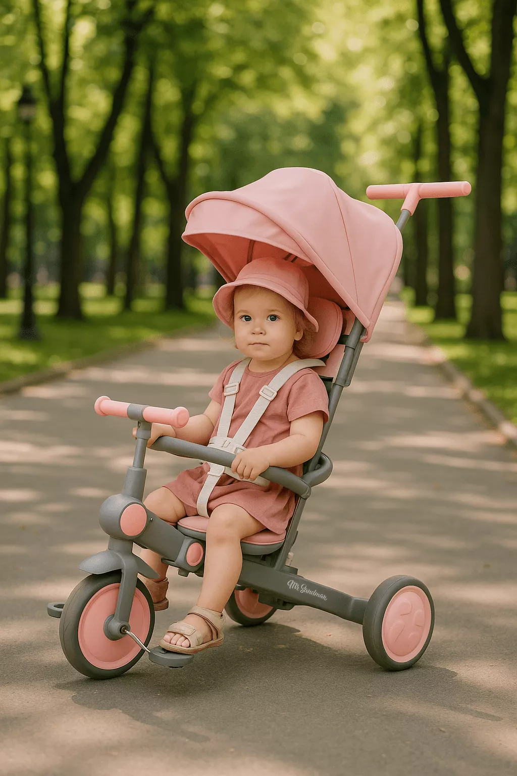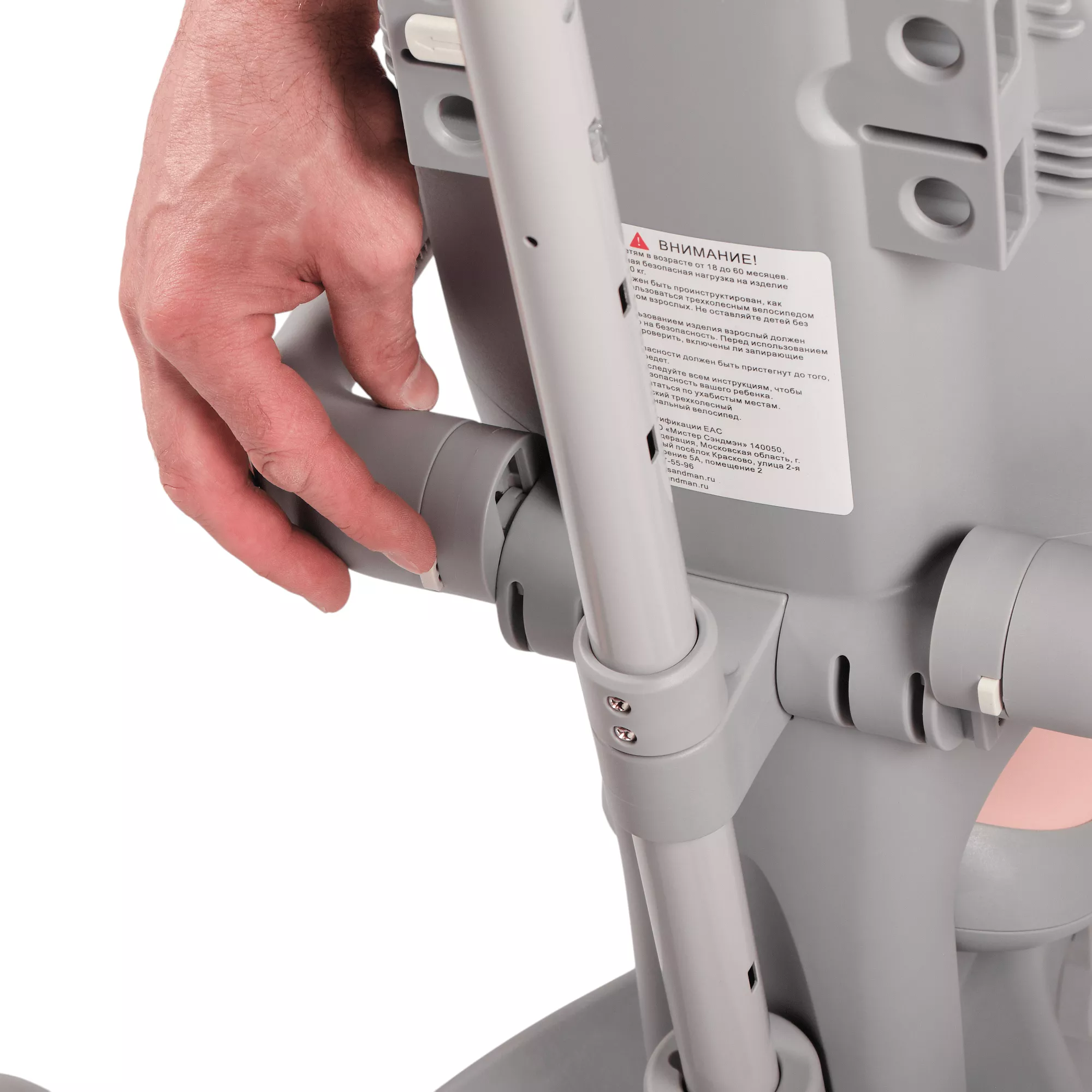 Все детали велосипеда снимаются: родительская ручка, капюшон от солнца, бампер, педали, спинка. Седло и спинка очень удобные и мягкие. Благодаря съемным переустанавливаем педалям, получаем удобную подставку под ноги для самых маленьких.Многофункциональный велосипед трансформер имеет 4 варианта конфигурации в зависимости от потребностей ребенка.
