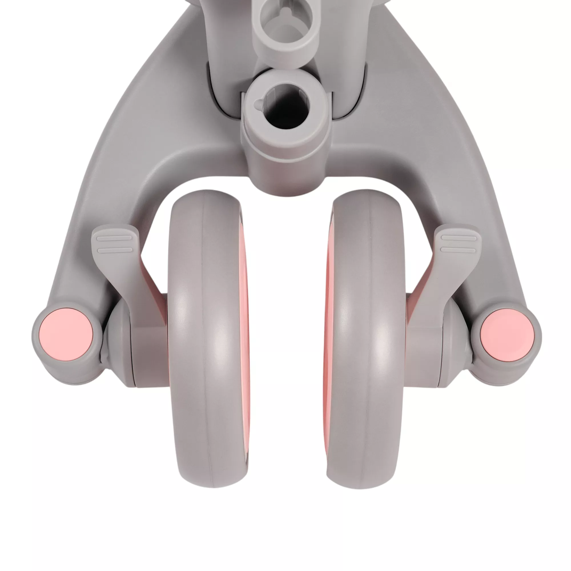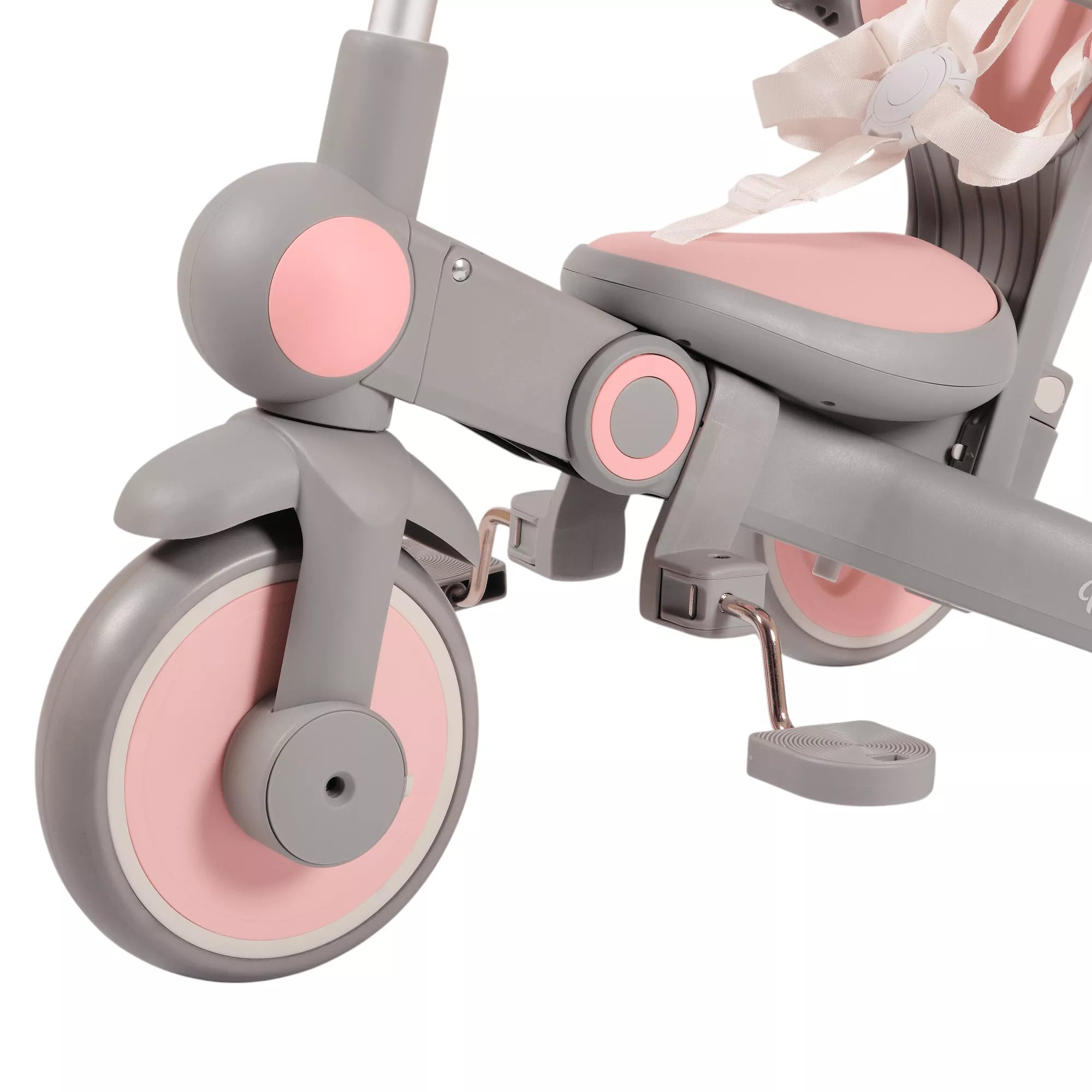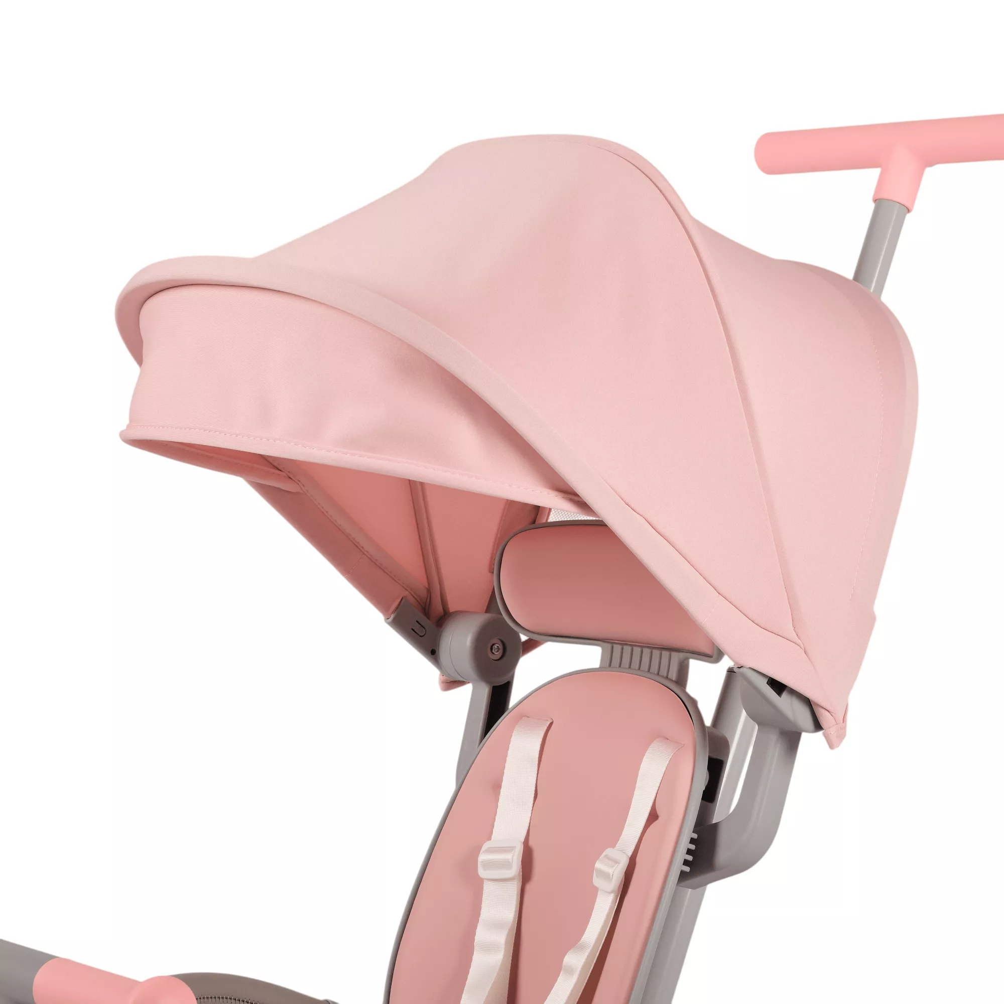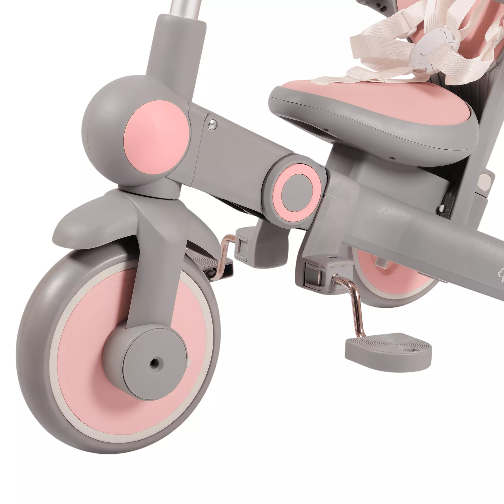 Все детали велосипеда снимаются: родительская ручка, капюшон от солнца, бампер, педали, спинка. Седло и спинка очень удобные и мягкие. Благодаря съемным переустанавливаем педалям, получаем удобную подставку под ноги для самых маленьких.Многофункциональный велосипед трансформер имеет 4 варианта конфигурации в зависимости от потребностей ребенка.