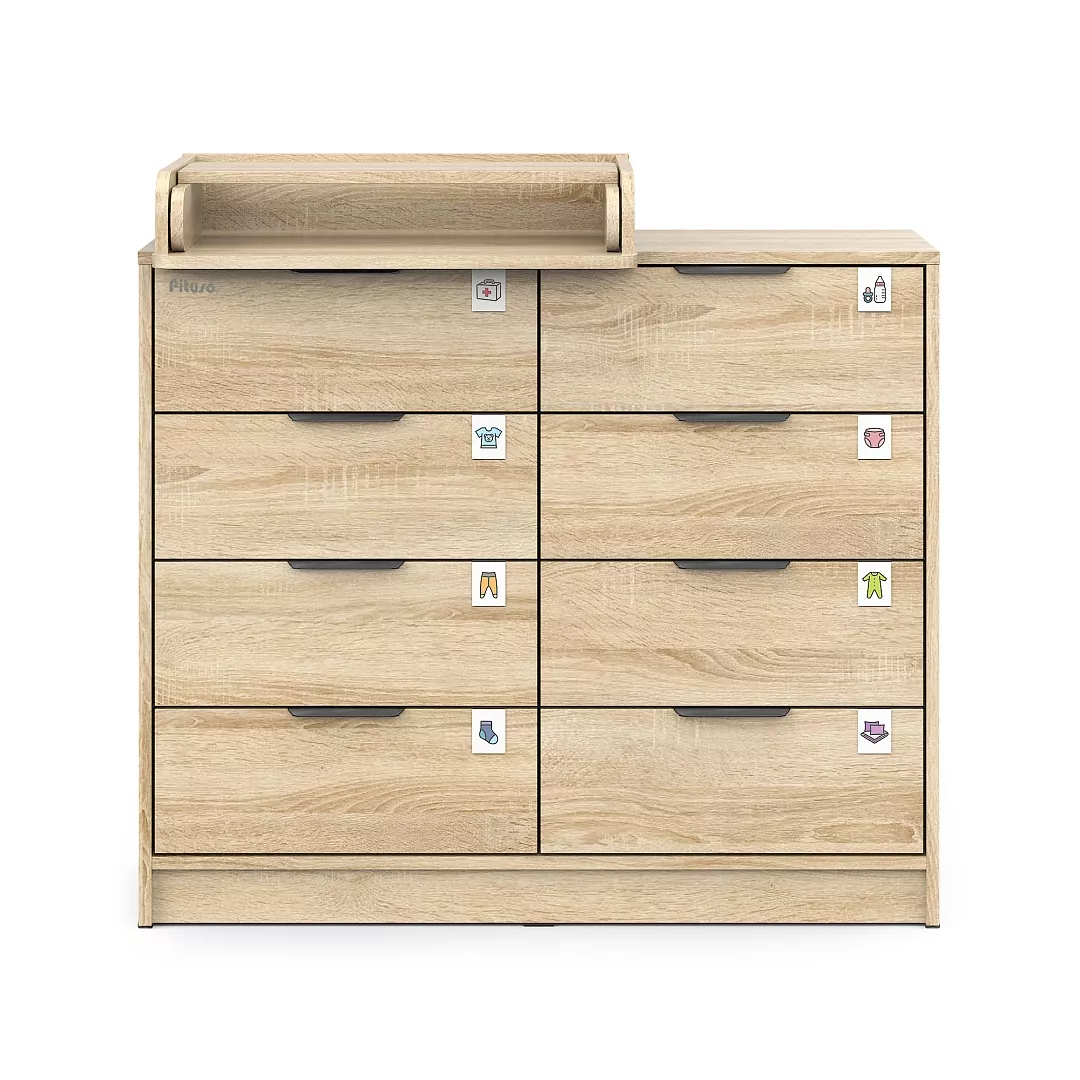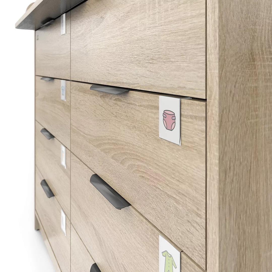 В комплекте с комодом идут специальные прозрачные пластиковые шильдики, которые, при желании, одеваются сверху на фасад. В них можно вставить любые картинки или рисунки. Базовый набор ярлычков-картинок принадлежностей для новорожденных в комплекте.