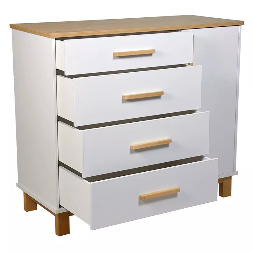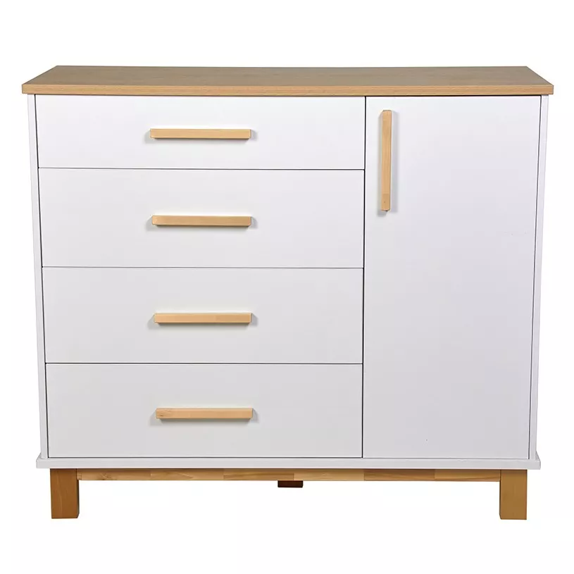 Комод имеет продуманную конструкцию, обеспечивающую функциональность при использовании, и при этом не выглядит громоздко благодаря высоким опорам. Изделие подходит для пеленания малышей благодаря возможности установки универсальной пеленальной рамы с бортиками, которая гарантирует удобство в уходе за ребенком и безопасность.