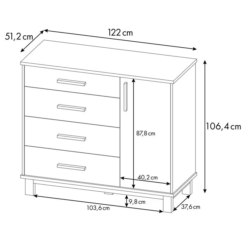 - 4 выдвижных ящика на шариковых направляющих;