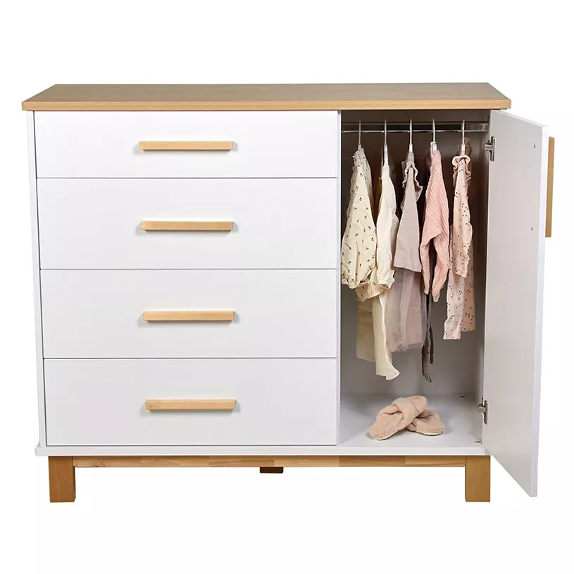Комод 3403 Simple помимо ящиков оснащен секцией со штангой для одежды, в которой детские вещи будут аккуратно развешены и даже останется место для хранения внизу. Если надобности в использовании штанги нет, то в данный отсек можно установить полочку (идет в комплекте), которая регулируется по высоте, тем самым увеличивая зону для хранения, ведь детских вещей никогда не бывает мало.